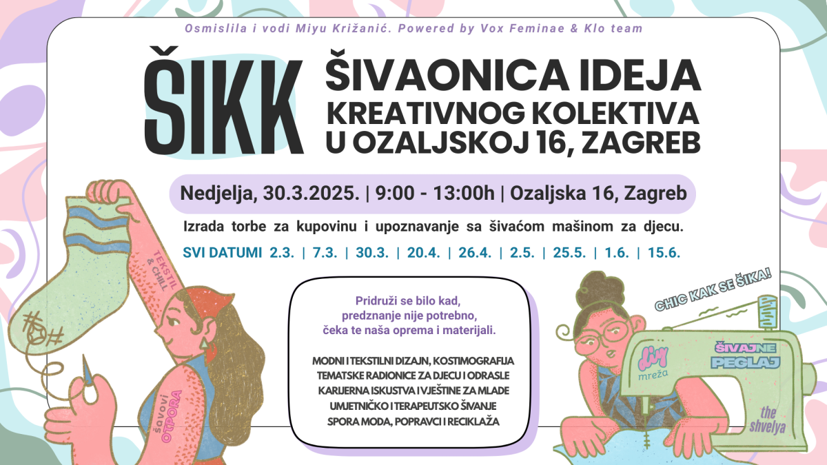 U nedjelju, 30. ožujka s početkom u 9 sati u DKC Šesnaestica održat će se susret ŠIKK Šivaonice ideja – kreativnog kolektiva. Susret će trajati 4 sata, a teme su izrada torbe za kupovinu i upoznavanje sa šivaćom mašinom za djecu.