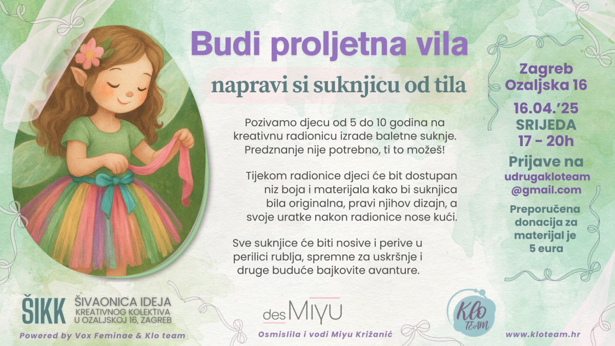 Pozivamo djecu od 5 do 10 godina na kreativnu radionicu izrade baletne suknje. Predznanje nije potrebno, ti to možeš! Tijekom radionice djeci će bit dostupan niz boja i materijala kako bi suknjica bila originalna, pravi njihov dizajn, a svoje uratke nakon radionice nose kući. Sve suknjice će biti nosive i perive u perilici rublja, spremne za uskršnje i druge buduće bajkovite avanture.