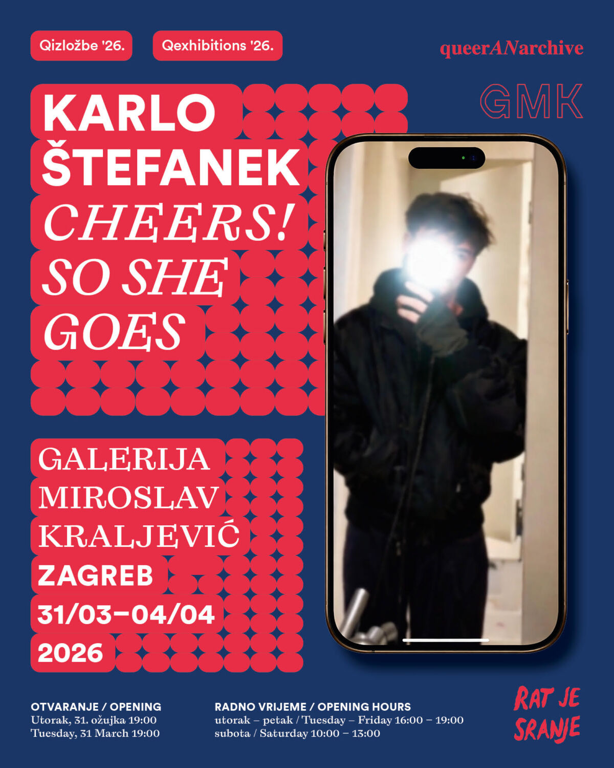U utorak, 31. ožujka u 19 sati u Galeriji Miroslava Kraljevića u Zagrebu otvara se izložba Karla Štefaneka Cheers! So she goes. Kroz ambijentalnu instalaciju koja galeriju transformira u prostor nalik kafiću, umjetnik istražuje osjećaj površne i iscrpljujuće digitalne komunikacije, oslanjajući se na koncept ne-mjesta Marca Augéa. Videoradovima, audioinstalacijom i intervencijama u prostoru tematizira otuđenost, usamljenost i iluziju povezanosti na društvenim mrežama, dok kroz kvir perspektivu kritički propituje uvjete identiteta i zajedništva u suvremenim digitalnim okruženjima. Izložba se može razgledati do petka od 16 do 19 sati i u subotu od 10 do 13 sati, zaključno s 4. travnja.