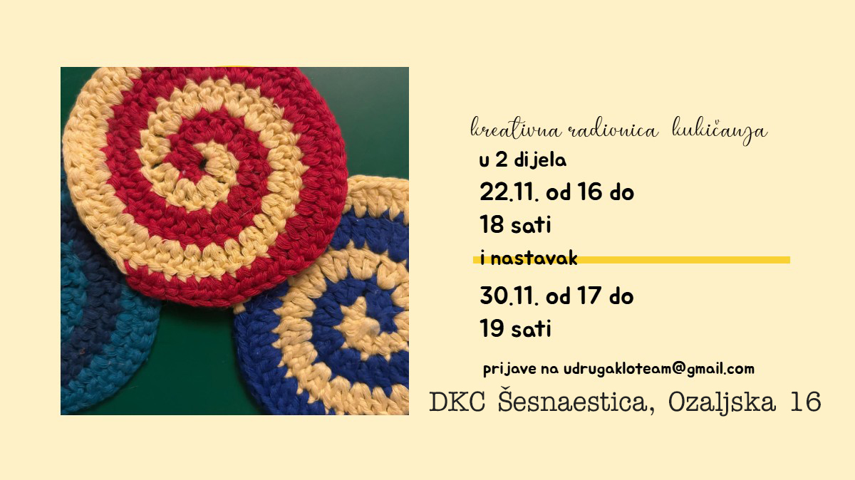 U subotu 22. studenog od 16 do 18 sati udruga Klo Team nastavlja s kreativnim radionicama kukičanja u prostoru DKC Šesnaestica (Ozaljska 16, 2. kat). Voditeljica radionica je majstorica kukičanja Kristina Ladika.