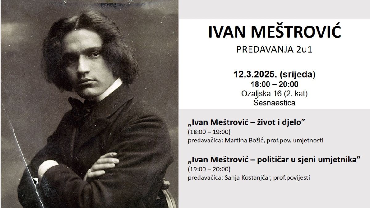 U srijedu, 5. ožujka, od 18:00 do 20:00 sati u DKC Šesnaestica održavaju se dva zanimljiva predavanja o velikanu našeg kiparstva Ivanu Meštroviću. Prvo predavanje „Ivan Meštrović – život i djelo“ održat će Martina Božić, prof. povijesti umjetnosti, a drugo „Ivan Meštrović – političar u sjeni umjetnika“ Sanja Kostanjčar, prof. povijesti.