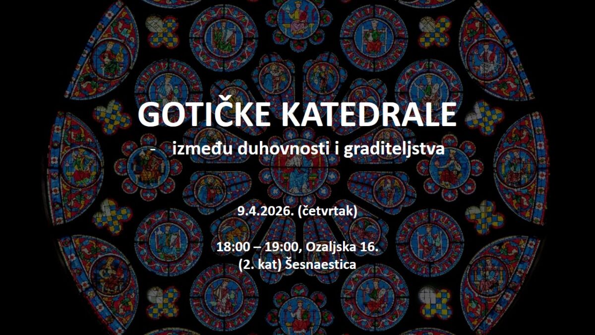 U četvrtak, 9. travnja 2026., s početkom u 18:00 u DKC Šesnaestica održava se predavanje „Gotičke katedrale – između duhovnosti i graditeljstva“. Predavanje drži profesorica povijesti likovne umjetnosti Martina Božić.