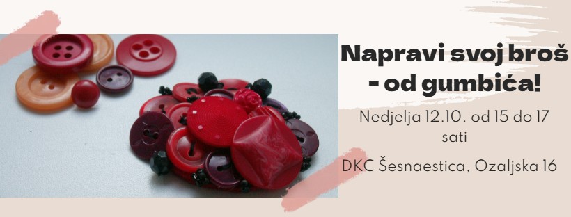 U nedjelju 12. listopada od 15 do 17 sati u DKC Šesnaestica (Ozaljska 16, Zagreb) održava se radionica izrade maštovitog broša od stvari koje svi imamo doma: gumbića i perlica!