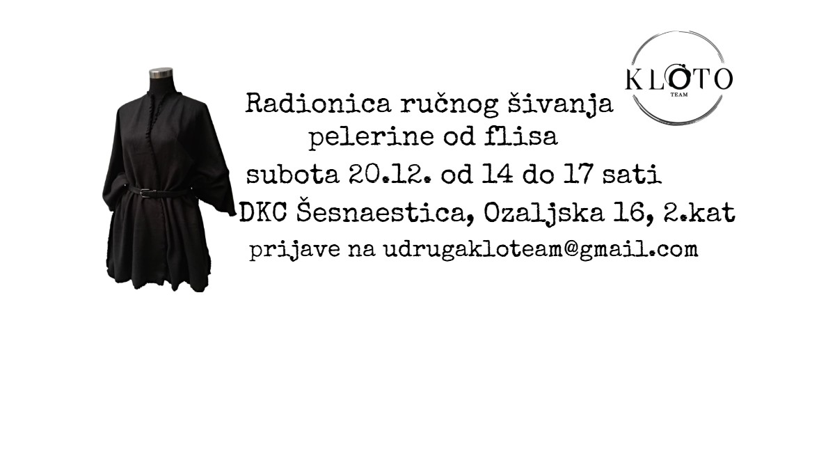 U subotu, 20. prosinca, od 14 do 17 sati u DKC Šesnaestica (Ozaljska 16, 2. kat) održava se kreativna radionica šivanja u organizaciji kreativne udruge Kloto team.