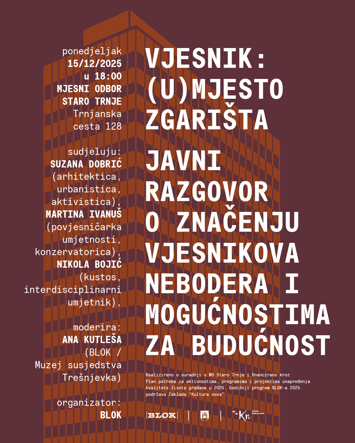 U samom kvartu kojemu Vjesnik pripada, Trnju, otvaramo pitanje o tome što je njegova baština i je li s požarom nepovratno izgubljena. Što je ovaj kompleks predstavljao za one koji su ga svaki dan gledali i hodali u njegovoj sjeni? Što on predstavlja za arhitektonsku i urbanističku struku i je li svojim tužnim krajem postao simbol generalne nebrige za nasljeđe modernizma? Kako bi mogla izgledati njegova budućnost? Pored interesa privatnog kapitala i golemog tržišnog potencijala parcele, ima li prostora za javni interes, participaciju građana i novi život baštine? Nakon što smo proteklih dana u medijskim prilozima mogli čitati i slušati brojna mišljenja, pozivamo Trnjane, Zagrepčanke, susjede, novinarke, arhitekte i urbanistice, aktiviste i građanke, ukratko, sve zainteresirane, da uživo poslušaju tri perspektive na ova pitanja i daju svoj doprinos raspravi.