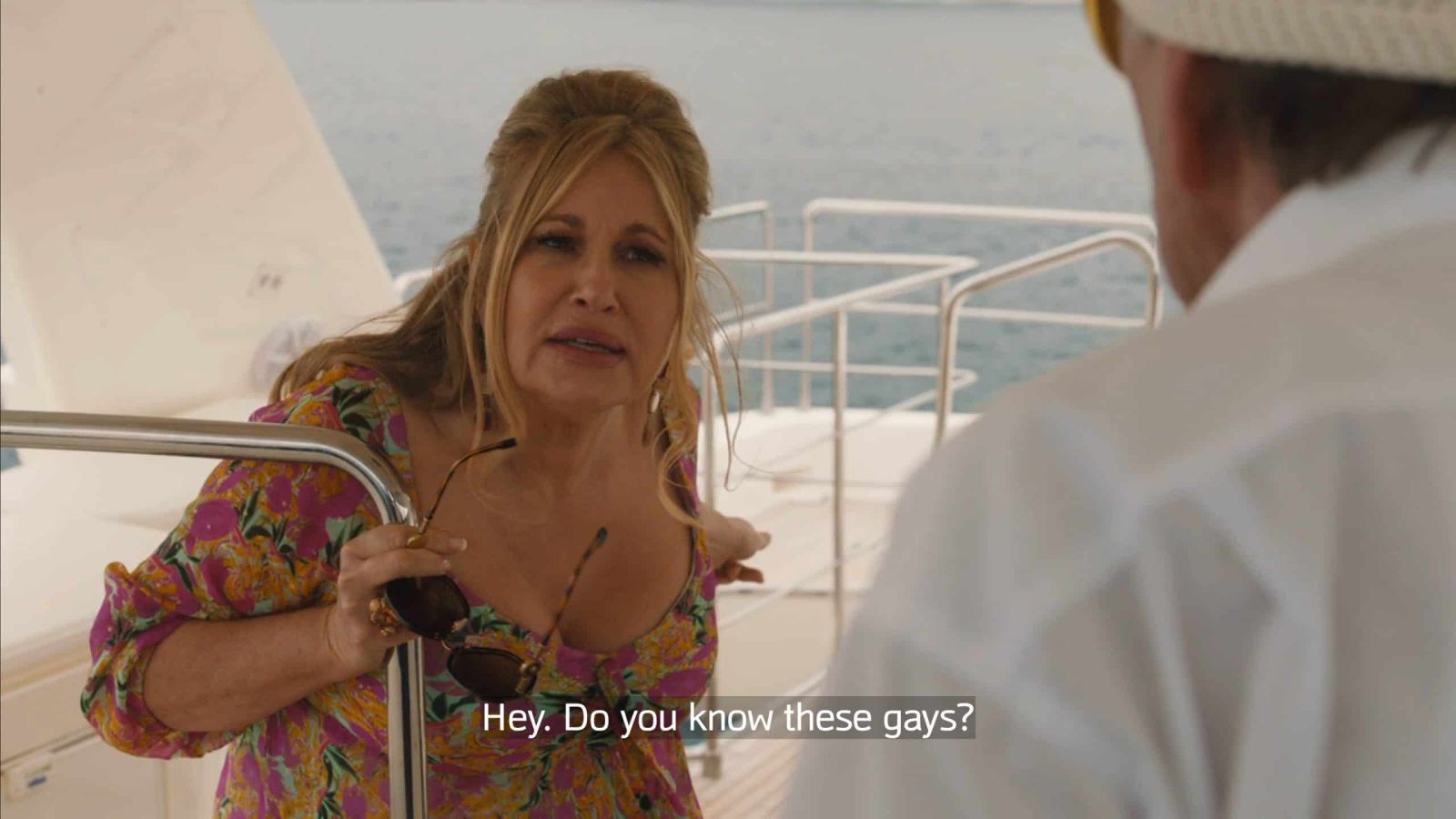Druga: u pretposljednoj epizodi druge sezone američke serije Bijeli lotos (engl. White Lotus) Tanya McQuoid (Jennifer Coolidge) žali se starom talijanskom kormilaru – koji je očigledno ne razumije – da je skupina sladokusnih sredovječnih pedera, koji su pozirali kao njezini prijatelji i saveznici, sada pokušava ubiti radi njezina novca.