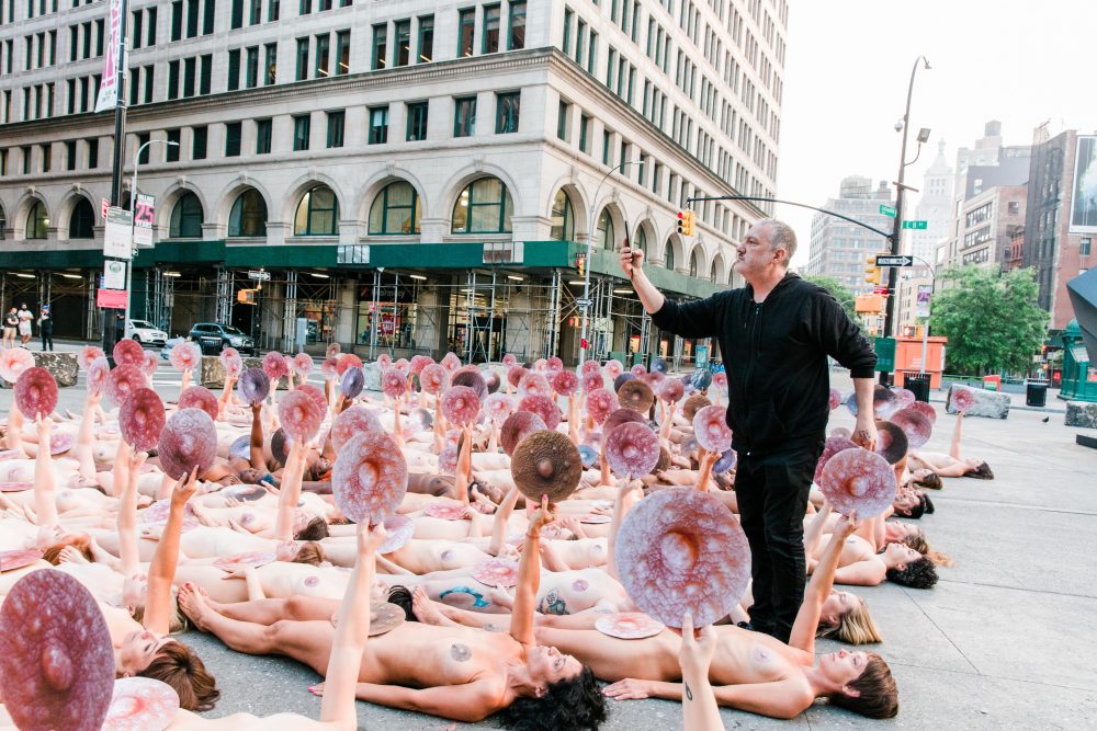 Tunick je poznat po fotografijama masovnih aktova u javnom prostoru, a organizirao je slične intervencije diljem svijeta, uključujući onu 2007. godine kada je skupina volontera_ki stajala gola na ledenjaku u Alpama kao dio kampanje o globalnom zagrijavanju.