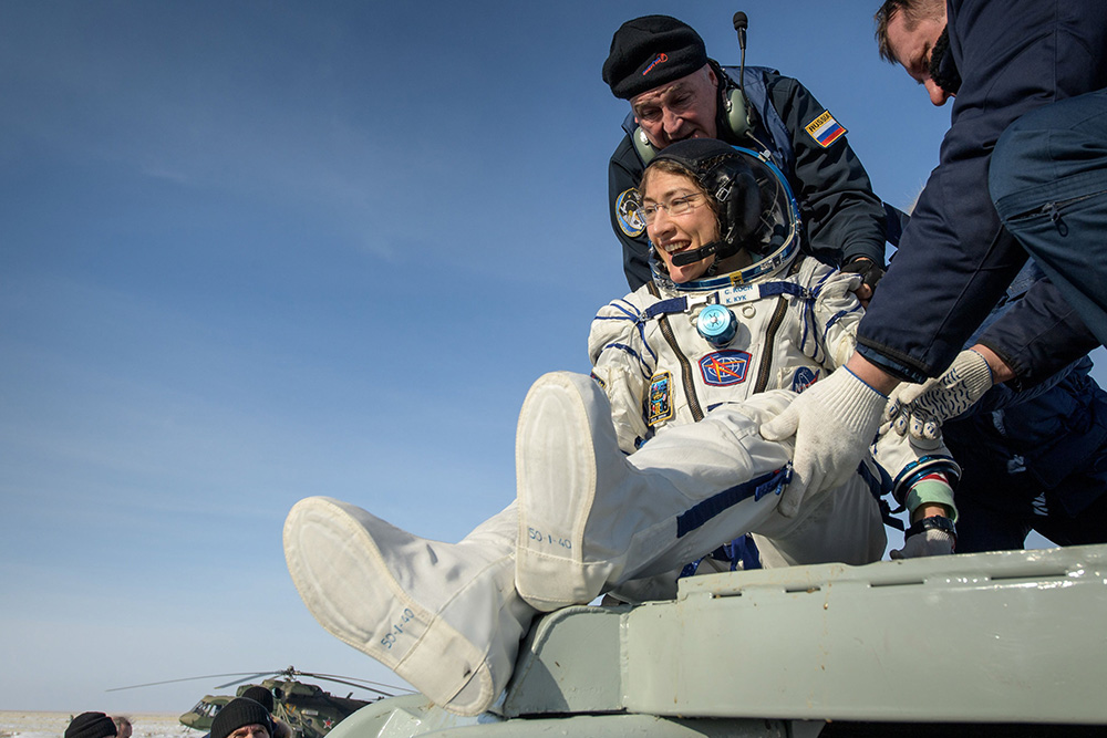 Koch se vratila na Zemlju 6. veljače 2020. godine, a u svemiru je ukupno provela 328 dana, 13 sati i 58 minuta. [K.D.] Huffington Post...